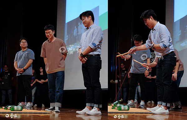 看著大家也全心投入遊戲時間也很感動,還有機會推銷一下台灣夜市的遊戲「釣酒瓶」。(大家加碼喊著要大叔天團三人要PK時,我還在暗處慘叫啊時間會低累啊)